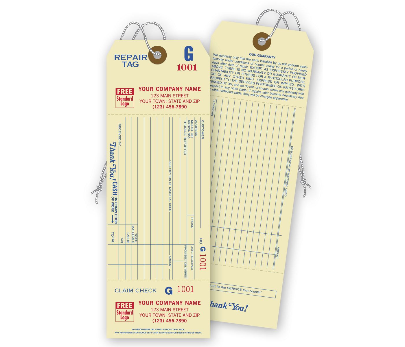 Repair Tags w/ Detachable Claim Check, 1 Part, Manilla